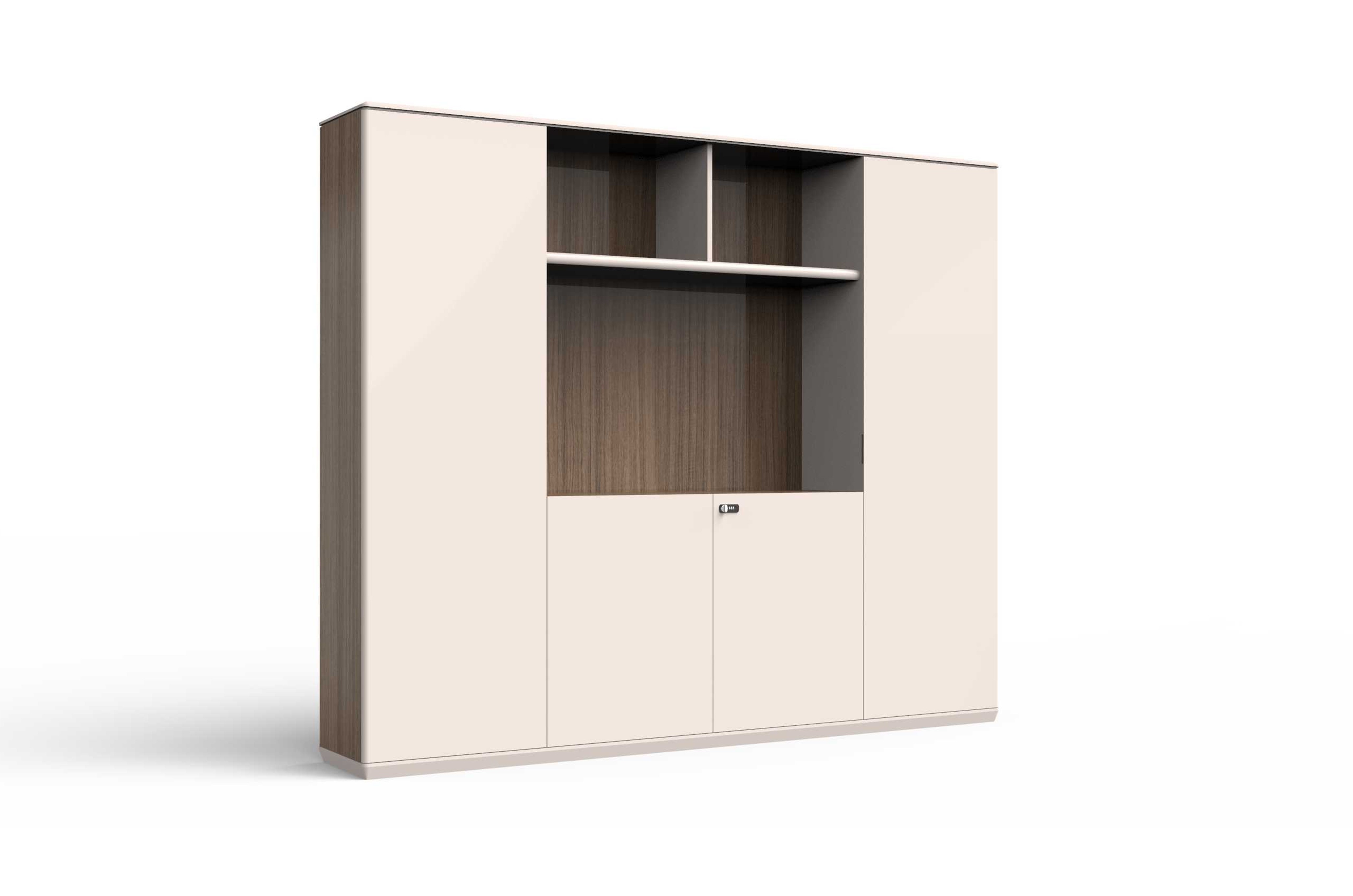 1.工藝:見光面采用E0級中密度纖維板+0.6mm天然木皮做水性漆/實色水性漆,非見光面、背板采用E0級刨花板貼三聚氰胺飾面 2.封邊:見光面天然木皮封邊/實色水性漆,非見光面采用優質PVC封邊 3.細節:臺面帶固定皮墊 4.配件:機械密碼鎖+“BMB”阻尼門鉸+CI散熱蓋+優質掛衣桿;