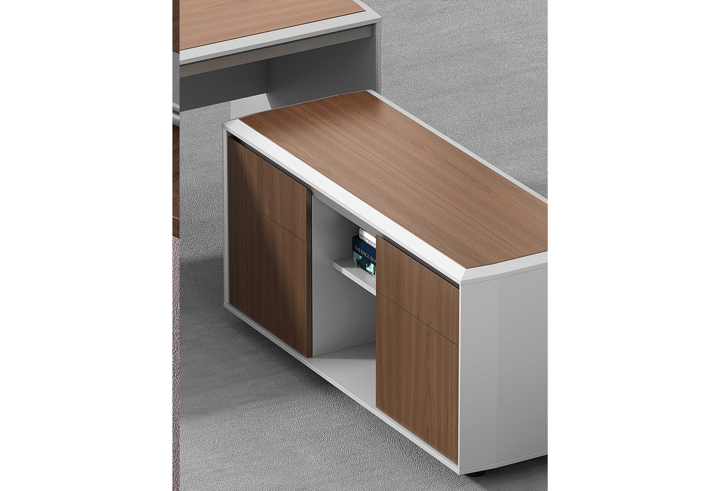 1.工藝:見光面采用E0級中密度纖維板+0.6mm天然木皮做水性漆/實色水性漆,非見光面采用E0級刨花板貼三聚氰胺飾面 2.封邊:見光面天然木皮封邊/實色水性漆,非見光面采用優質PVC封邊 3.配件:“BMB”牌 緩沖門鉸+優質ABS圓柱形調節腳