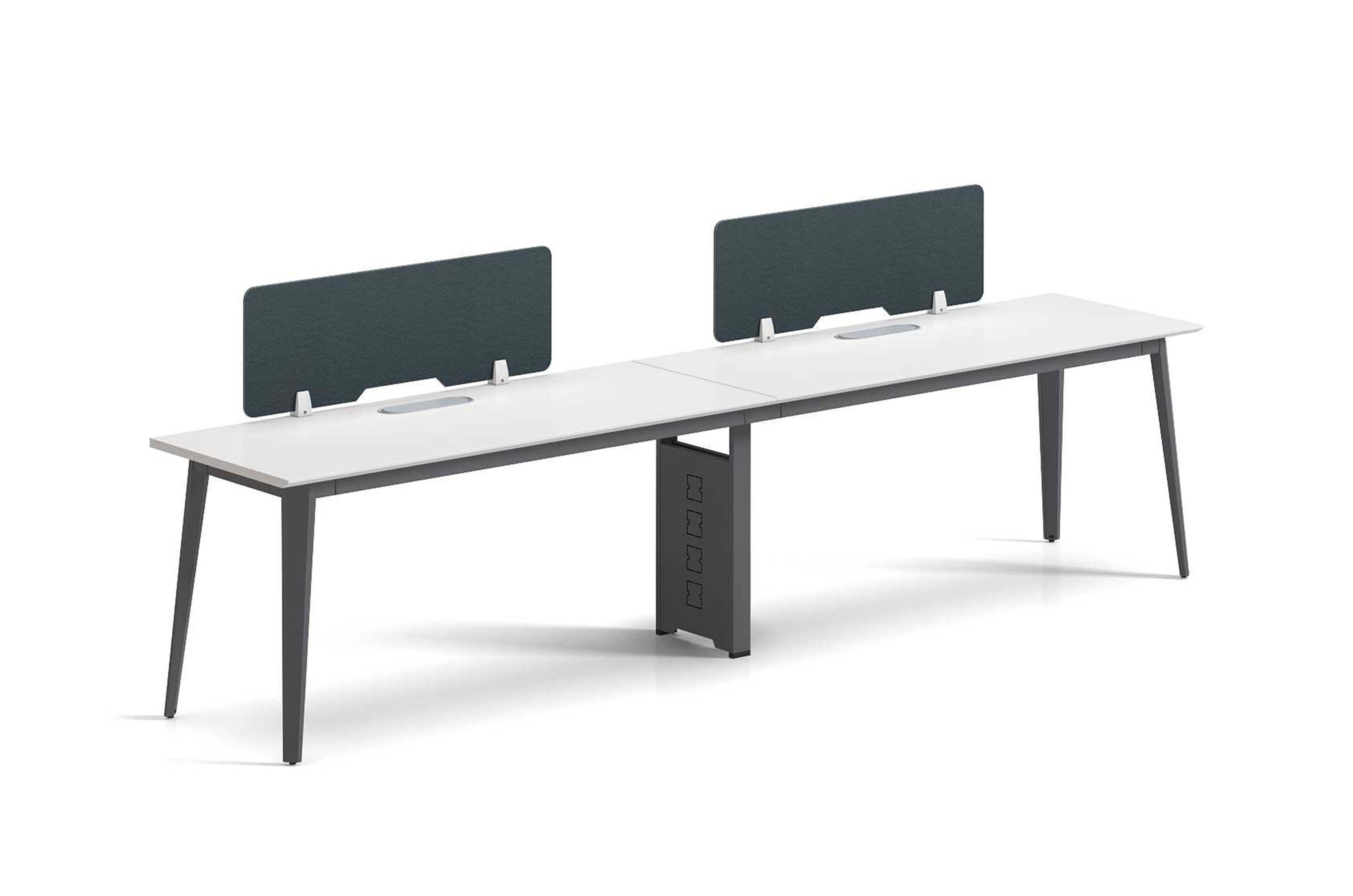 1.工藝:采用E0級刨花板貼三聚氰胺飾面 2.封邊:采用優質PVC封邊 3.屏風:ML403藍色皮紋無框桌屏; 4.五金:1.5mm壁厚鋼腳+1.6mm壁厚鋼制橫梁 5.走線:臺面配OP線蓋; 6.選配:可選配多款線槽;