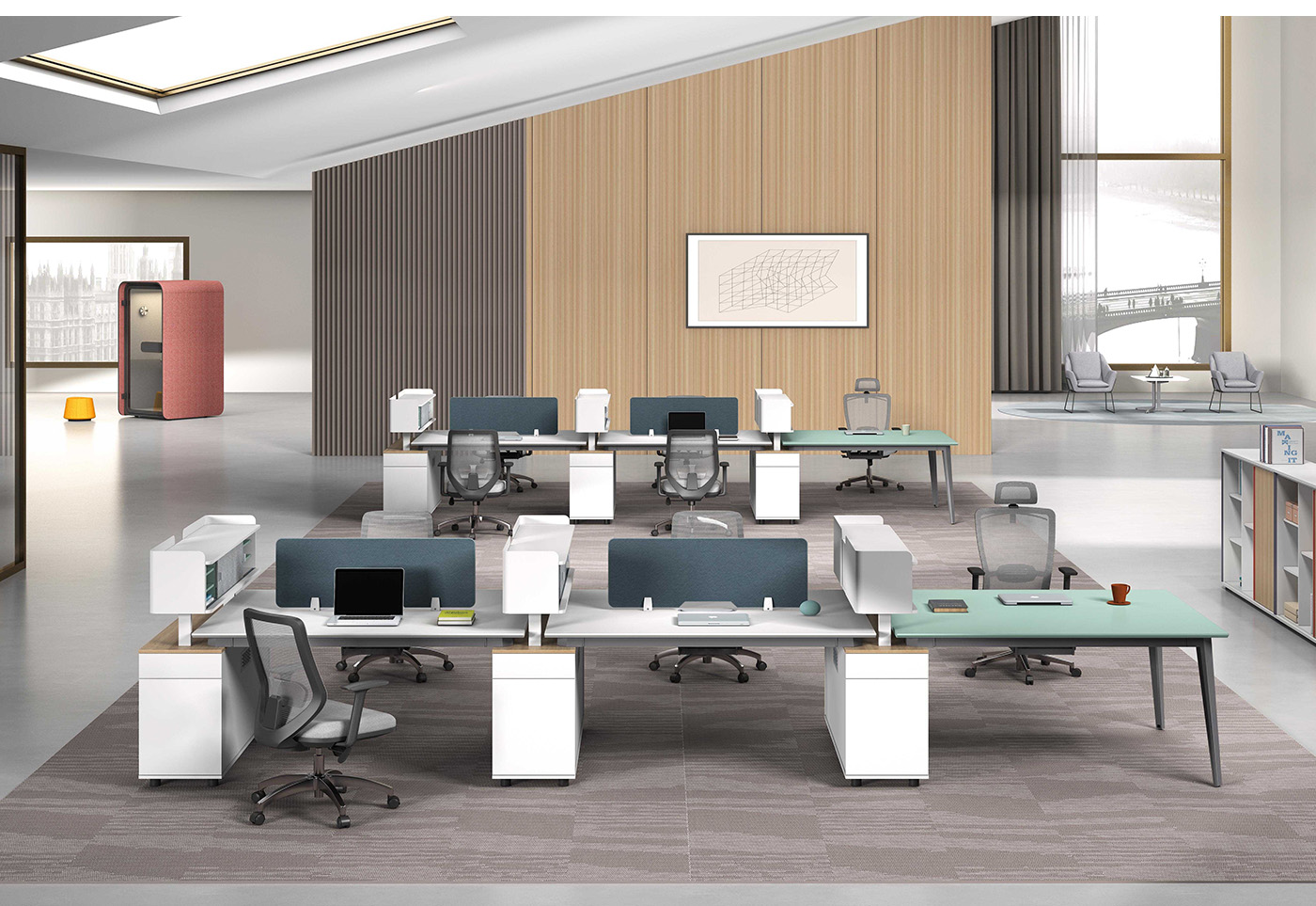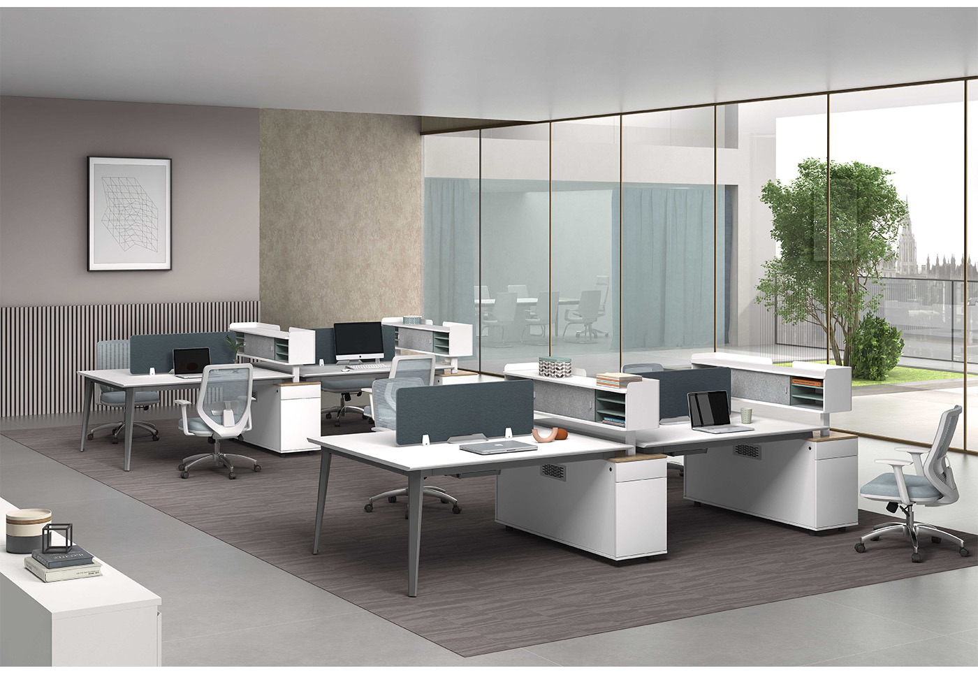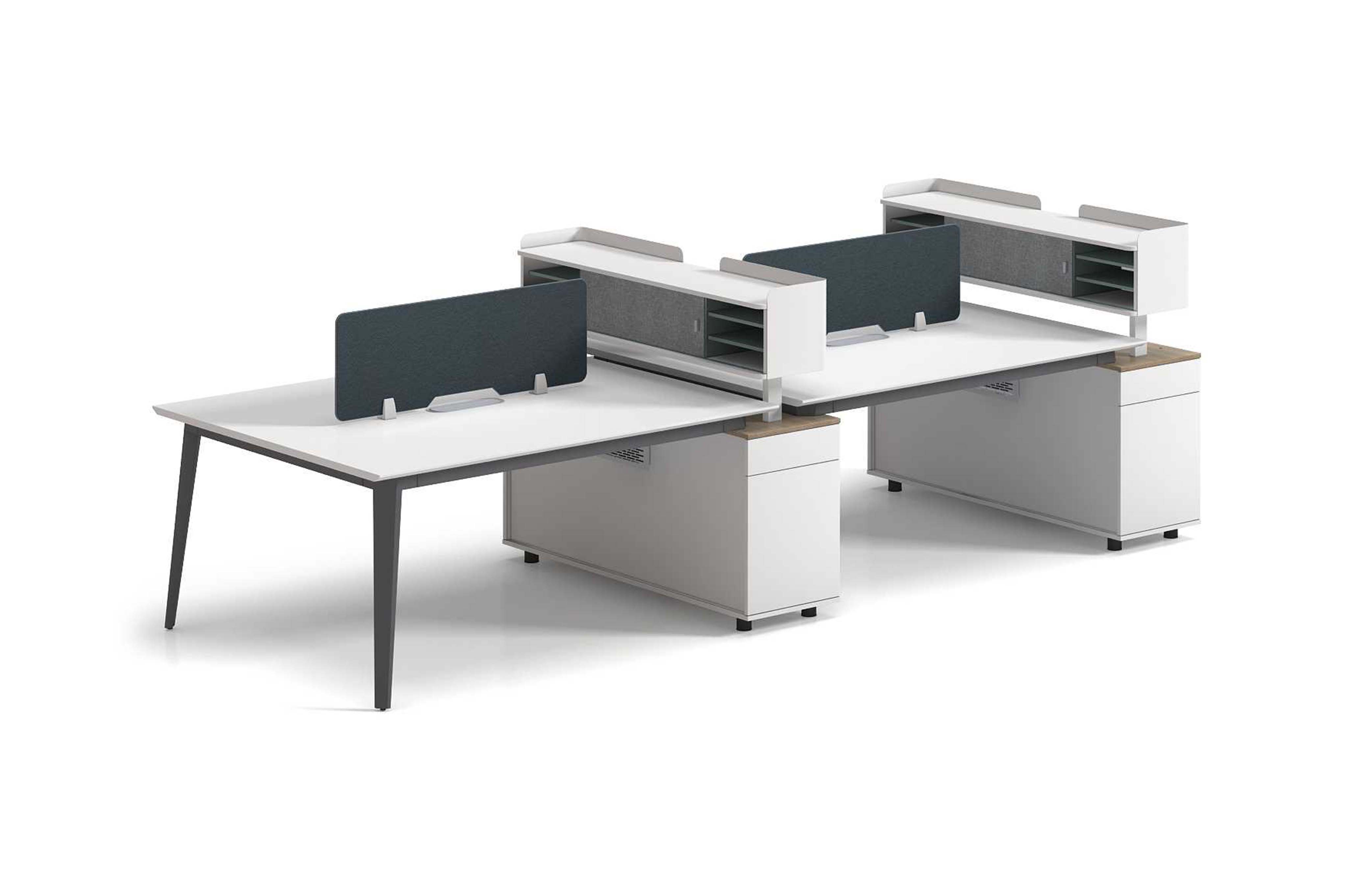 1.工藝:采用E0級刨花板貼三聚氰胺飾面 2.封邊:采用優質PVC封邊 3.屏風:ML403藍色皮紋無框桌屏; 4.五金:鋼制文件架擋板(壁厚1.5mm)+1.5mm壁厚鋼腳+1.6mm壁厚鋼制橫梁; 5.配件:優質鋁合金散熱蓋+優質鋁合金趟門配件+鋁合金拉手+優質ABS圓柱形調節腳; 6.走線:臺面配OP線蓋; 7.選配:可選配多款線槽;
