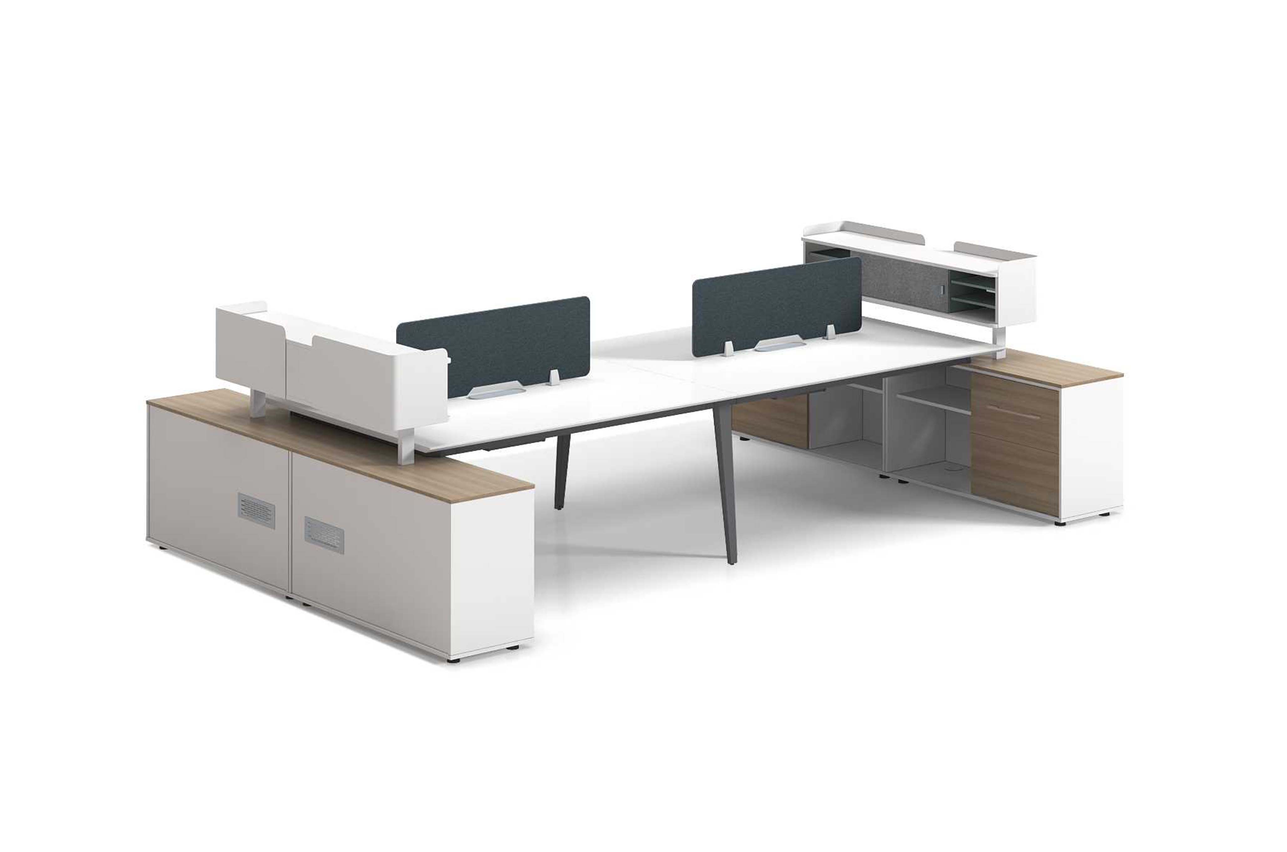 1.工藝:采用E0級刨花板貼三聚氰胺飾面 2.封邊:采用優質PVC封邊 3.屏風:ML403藍色皮紋無框桌屏; 4.五金:鋼制文件架擋板(壁厚1.5mm)+1.5mm壁厚鋼腳+1.6mm壁厚鋼制橫梁; 5.配件:優質鋁合金散熱蓋+優質鋁合金趟門配件+鋁合金拉手+優質ABS圓柱形調節腳; 6.走線:臺面配OP線蓋; 7.選配:可選配多款線槽;