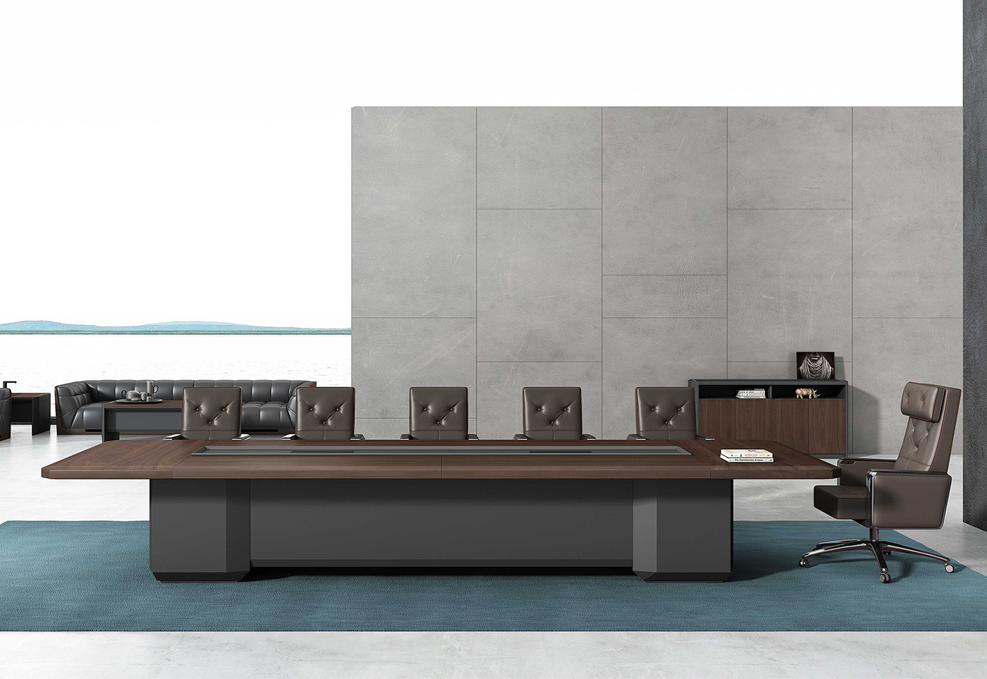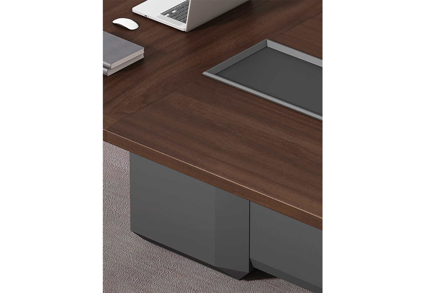 1.工藝:見光面采用E0級中密度纖維板+0.6mm天然木皮做水性漆/實色水性漆,非見光面采用E0級刨花板貼三聚氰胺飾面 2.封邊:見光面天然木皮封邊/實色水性漆,非見光面采用優(yōu)質(zhì)PVC封邊 3.配件:“BMB”牌 緩沖門鉸+高端雙面黑色翻蓋線盒; 4.皮革:SN406灰色皮紋; 5.走線:臺面配OC鋁合金雙開線蓋,內(nèi)部走線,內(nèi)配4個五孔插座;