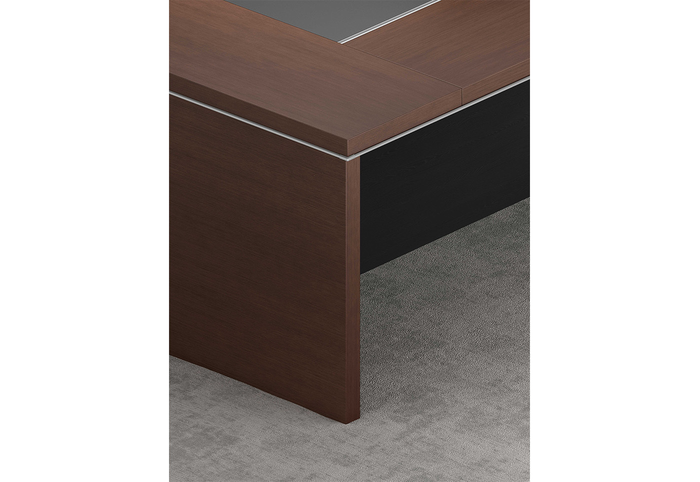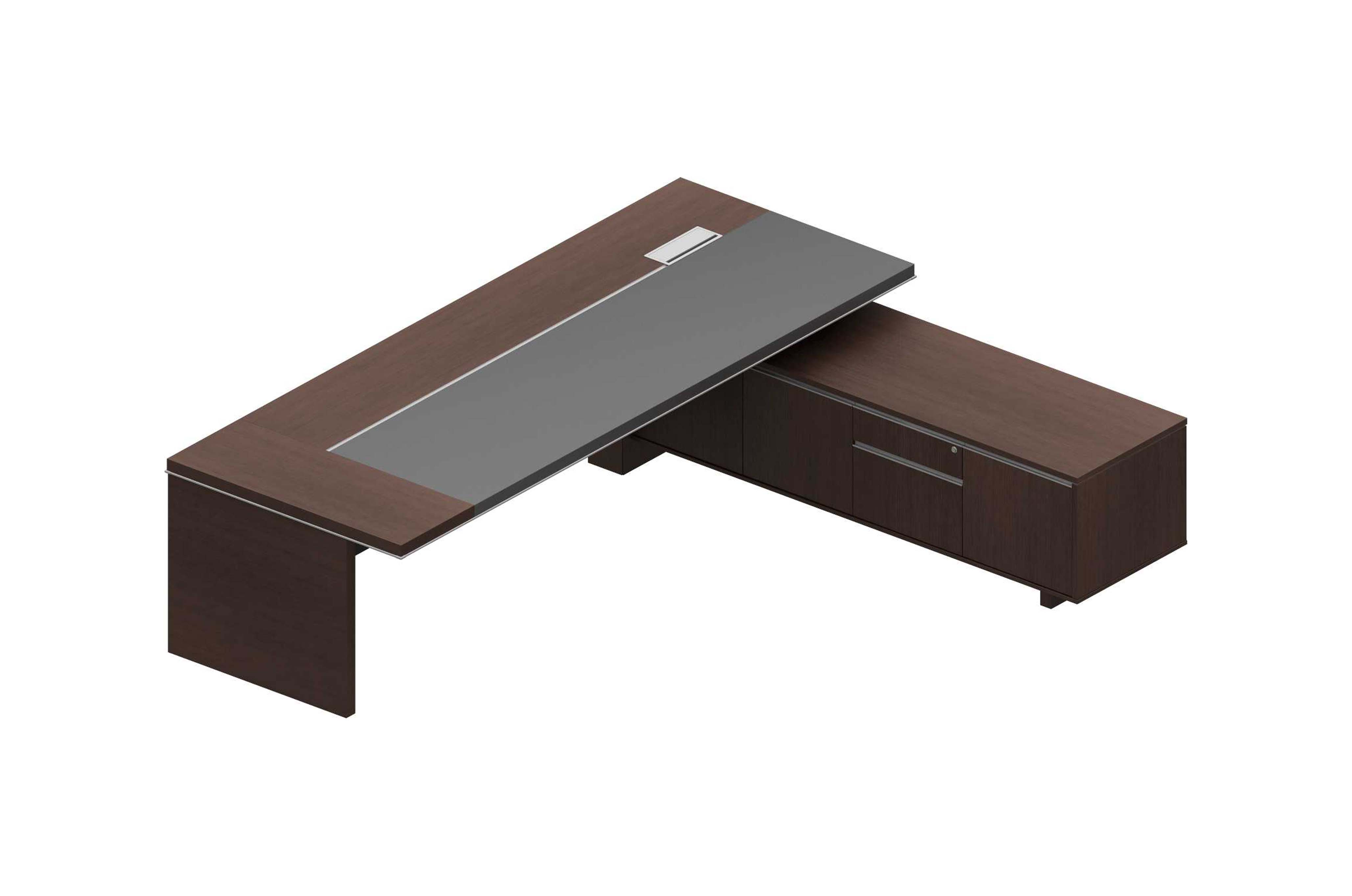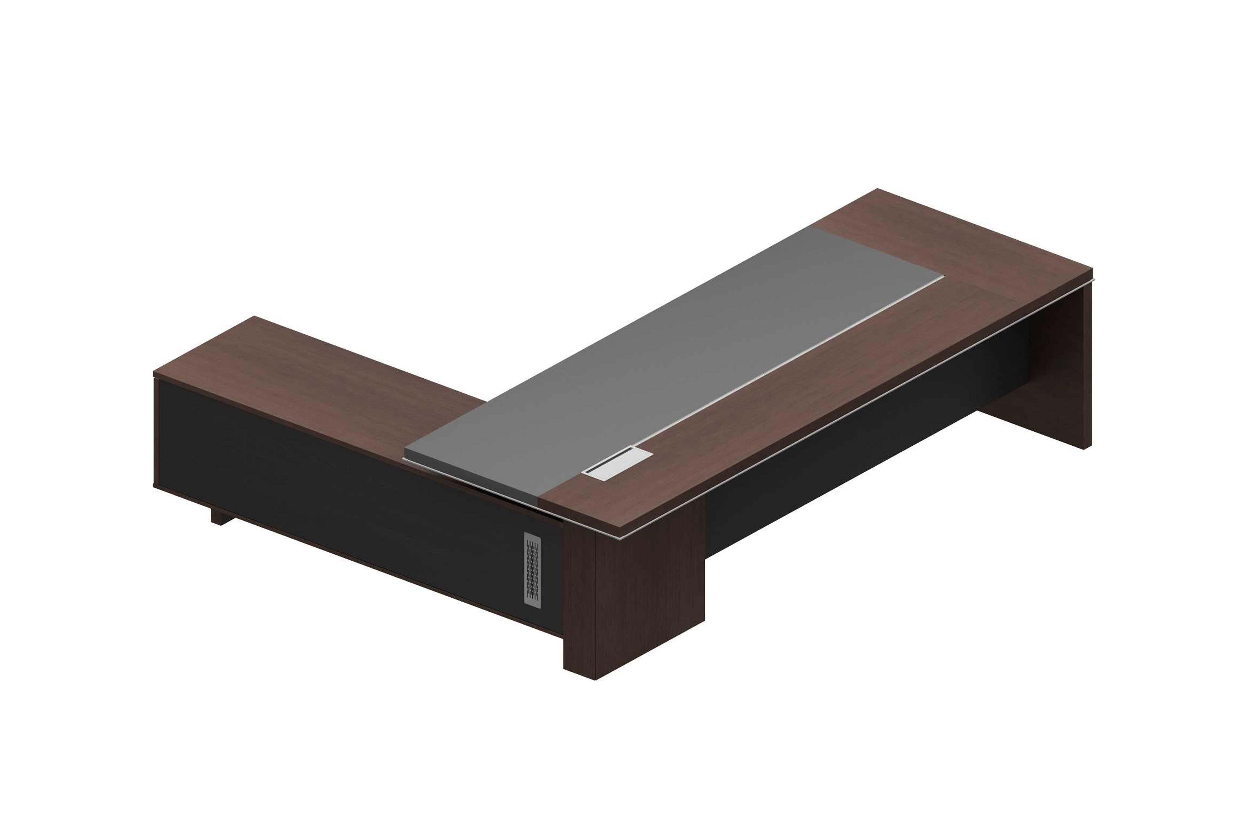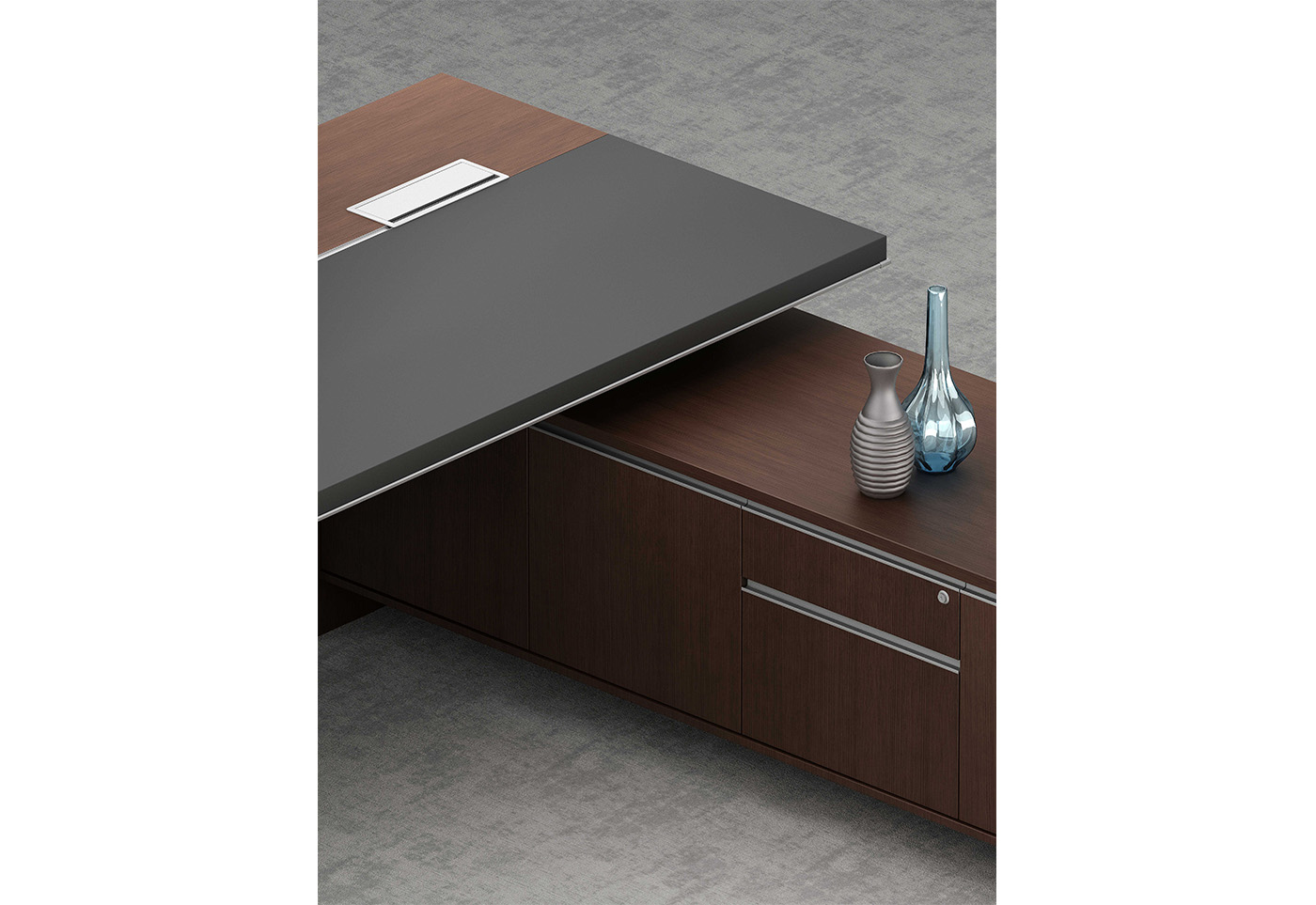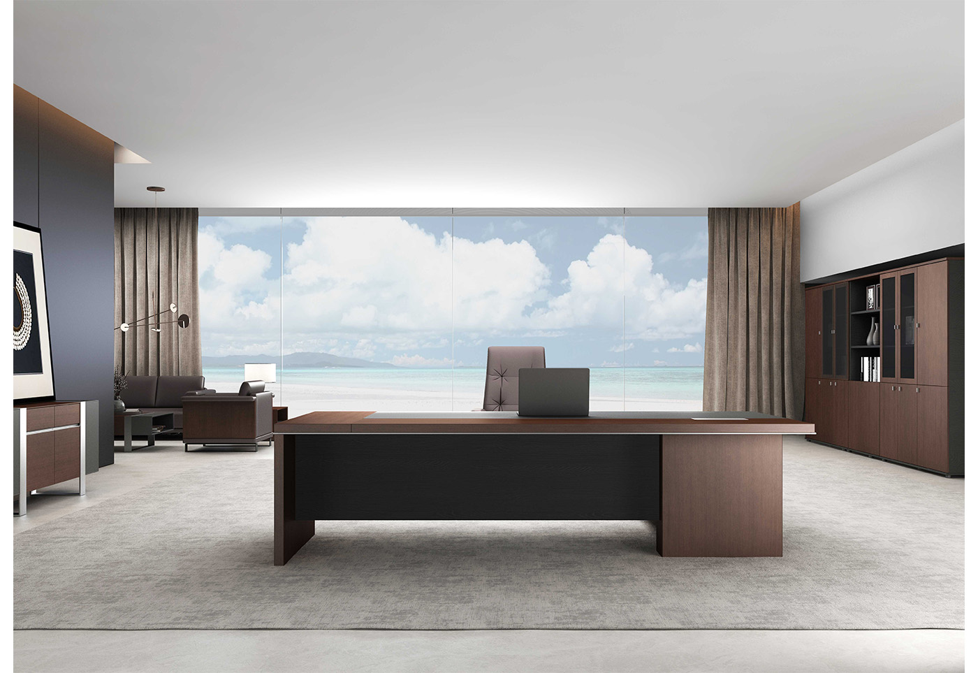 1.工藝:見光面采用E0級中密度纖維板+0.6mm天然木皮做水性漆/實色水性漆,非見光面采用E0級刨花板貼三聚氰胺飾面 2.封邊:見光面天然木皮封邊/實色水性漆,非見光面采用優質PVC封邊 3.五金:“BMB”牌緩沖導軌+“BMB”牌阻尼門鉸+鋁合金型材拉手+優質抽屜鎖+鋁合金散熱蓋; 4.配件:打砂氧化銀色鋁合金型材包邊、鋁合金臺面分隔裝飾條; 5.細節:臺面內嵌皮墊; 6.走線:臺面配OV鋁合金線蓋,副柜內部走線,內配?80圓形過線盒+86線盒孔; 7.班臺分左右;