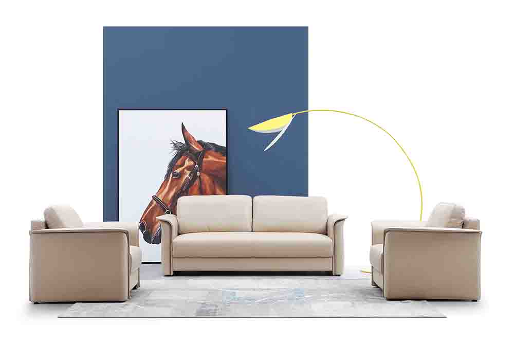 1.基材;多層夾板,含水率9%以下;木方桉木,松木方(四面創光),含水率10% 2.海綿;靠背使用,35KG/m3密度高回彈切割棉;座使用42KG/m3密度高回彈切割棉 3.承重彈力結構;靠背裝釘橡筋式中纖板十面網;坐墊蛇形彈簧直徑4.0 間距13公分+平衡線+平衡橡筋+面網; 4.填充物公仔棉+鴨毛 5.調節腳 飾面:可選布藝、科技皮及半真皮 包裝方式:最內為加厚珍珠棉、紙板、編織袋