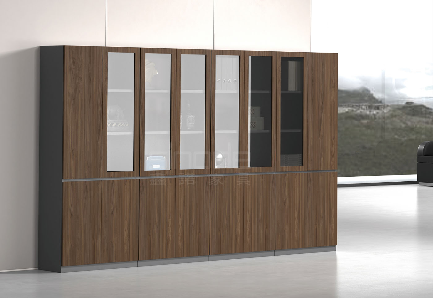 1.工藝:木紋色采用E0級中密度纖維板+0.6mm天然木皮做水性漆,實色采用E0級刨花板貼三聚氰胺飾面; 2.封邊:木紋色天然木皮封邊,實色采用優(yōu)質(zhì)PVC封邊; 3.配件:優(yōu)質(zhì)門鉸+木框玻璃門+優(yōu)質(zhì)雙門鎖; 4.文件柜分左右;