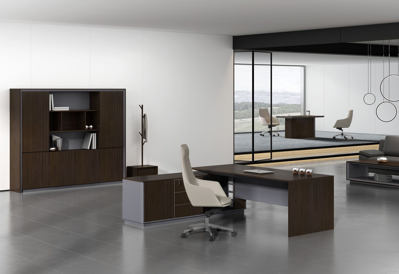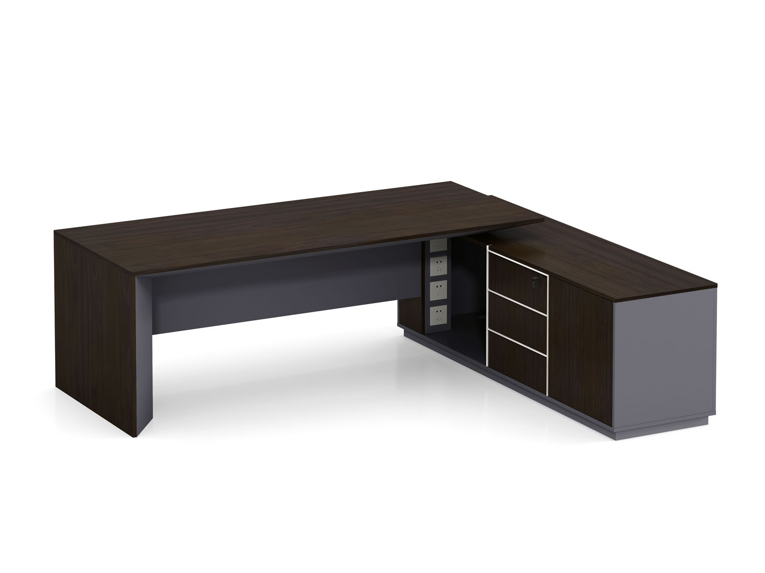 1.基材:采用E0級(jí)中密度纖維板+0.6mm天然木皮; 2.油漆:臺(tái)灣大寶水性凈味漆; 3.配件:“BIM”牌 緩沖門鉸+“BIM”牌阻尼導(dǎo)軌+集成線盒+通體拉手; 4.走線:副柜內(nèi)部走線,內(nèi)配?80圓形過線盒,配OEXH303A集成插座; 5.班臺(tái)分左右; 6.選配:皮墊;