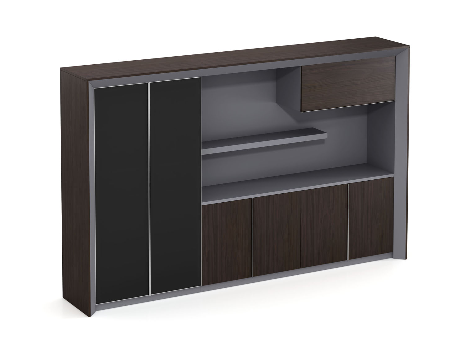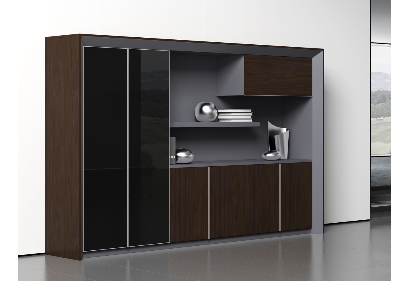 1.工藝:見光面采用E0級中密度纖維板+0.6mm天然木皮做水性漆/實色水性漆,非見光面采用E0級刨花板貼三聚氰胺飾面; 2.封邊:見光面天然木皮封邊/實色水性漆,非見光面采用優質PVC封邊; 3.配件:“BIM”牌 緩沖門鉸+鋁合金薄邊框鋼化黑玻璃門+通體拉手;