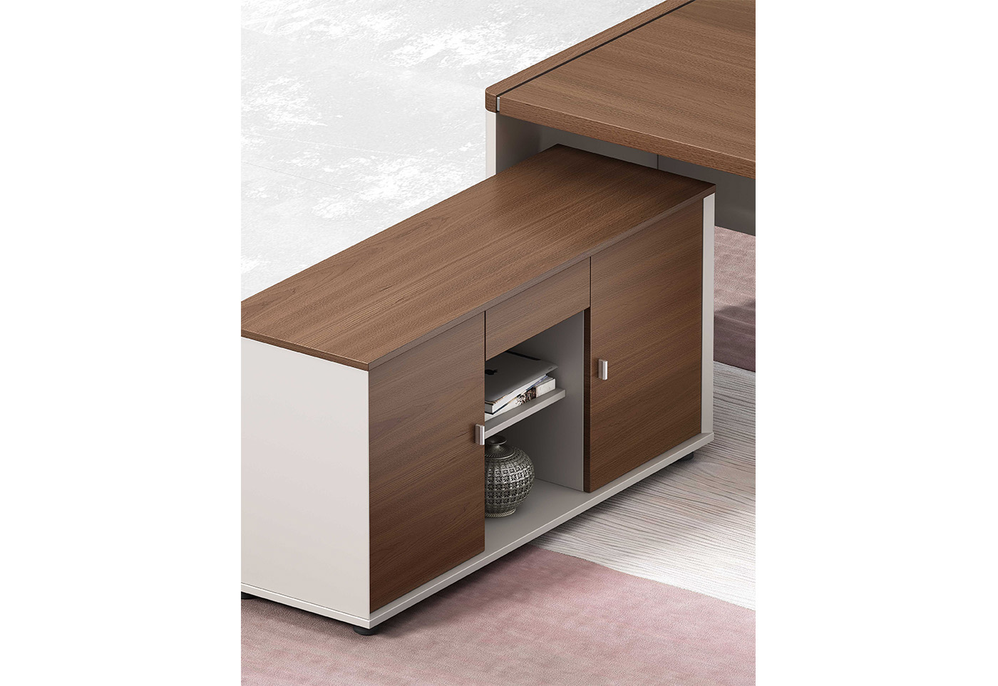 1.工藝:采用E0級刨花板貼三聚氰胺飾面 2.封邊:采用優質PVC封邊 3.配件:“BMB”牌阻尼門鉸+"BMB"牌導軌+鋁合金斜邊裝飾鋁條+鍍珍珠鉻色鉛筆拉手+優質ABS圓柱形調節腳;