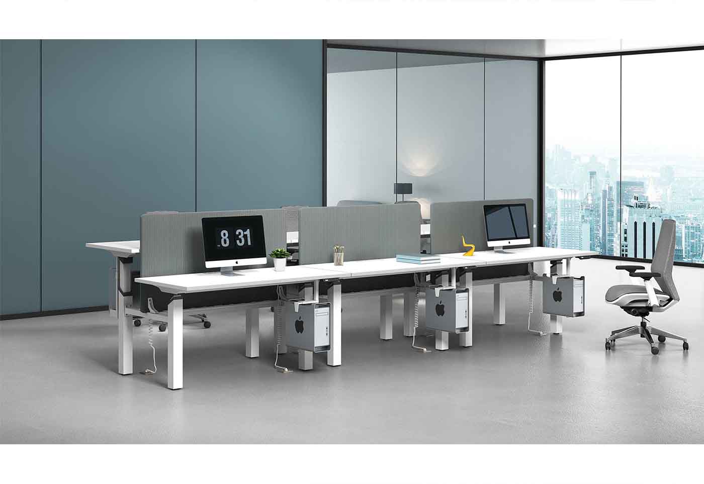 1.工藝:采用E0級刨花板貼三聚氰胺飾面 2.封邊:采用優(yōu)質PVC封邊 3.五金:雙電機升降桌腳,四檔高度記憶,遇阻回退功能,配三通彈簧線; 4.臺面配大白雙面六插電源; 5.選配:可選配鋼制活動柜、木制活動柜、主機架、蛇形管等;